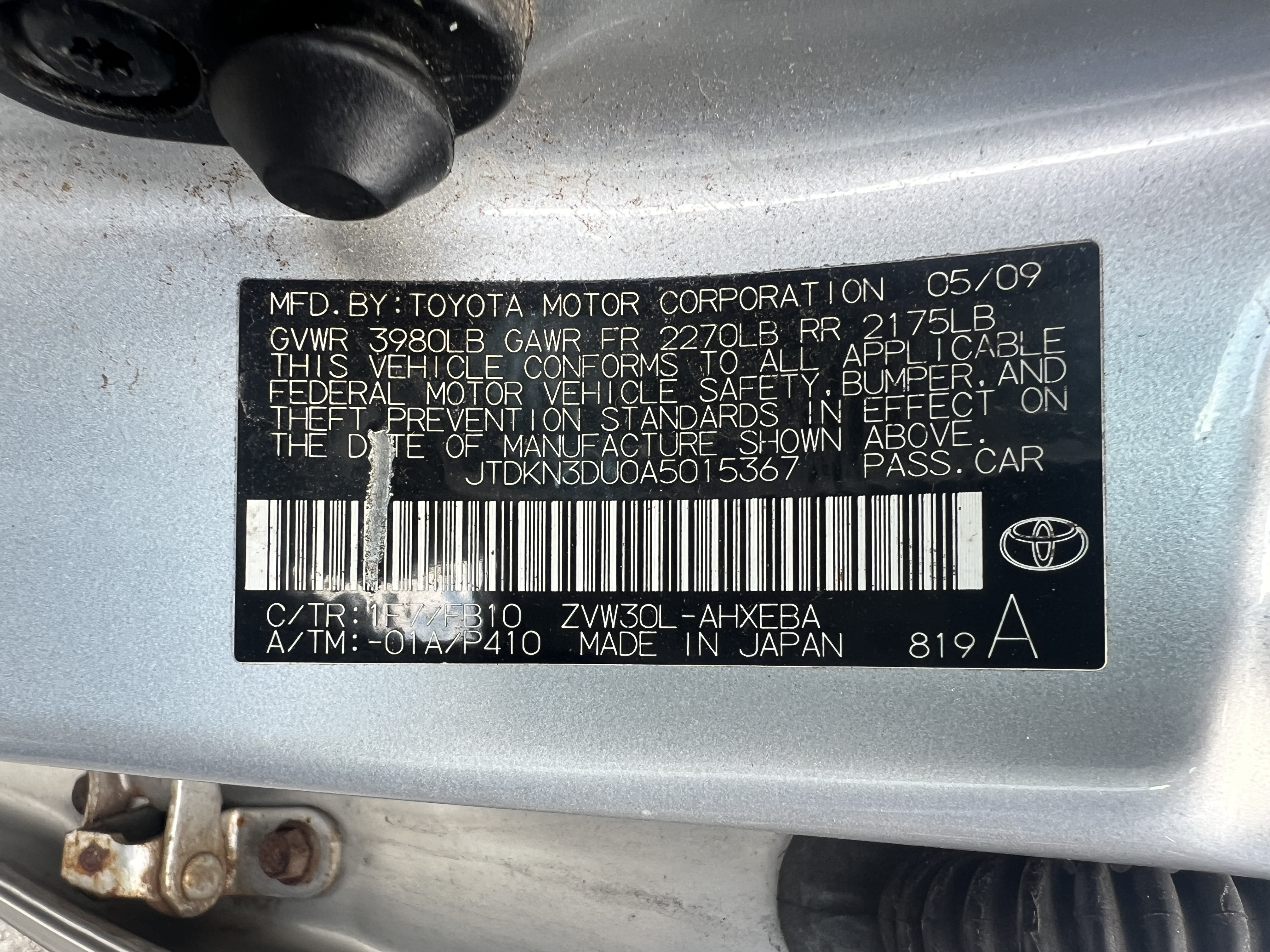 | VIN | JTDKN3DU0A5* |