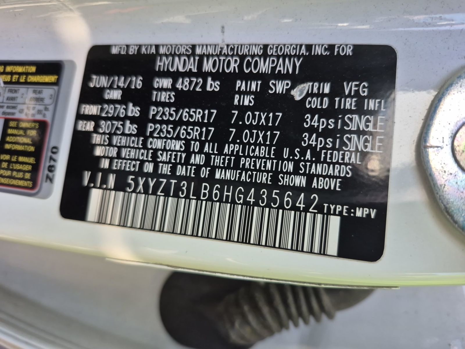 | VIN | 5XYZT3LB6HG* |