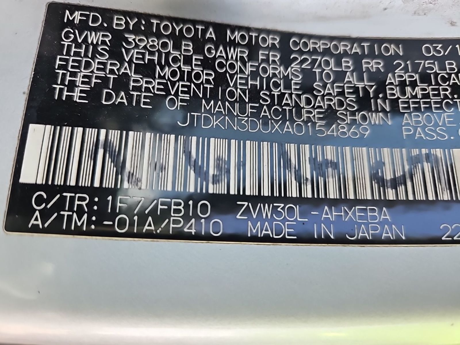 | VIN | JTDKN3DUXA0* |